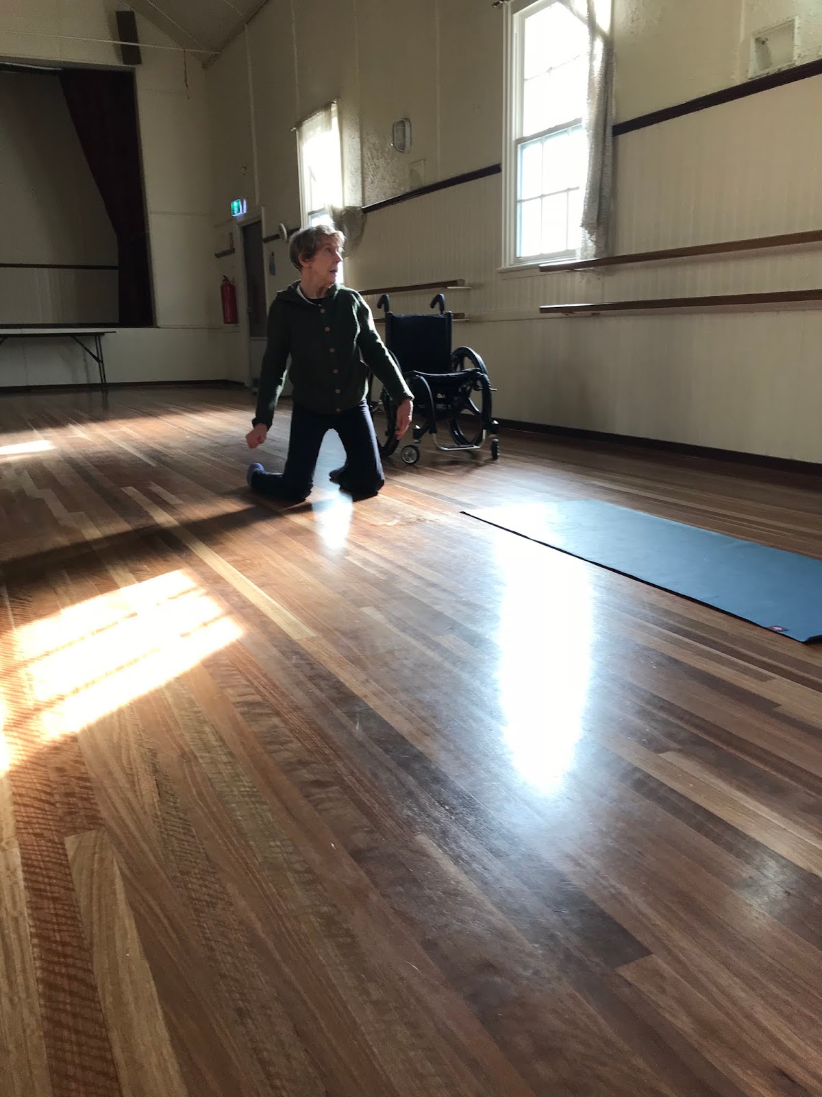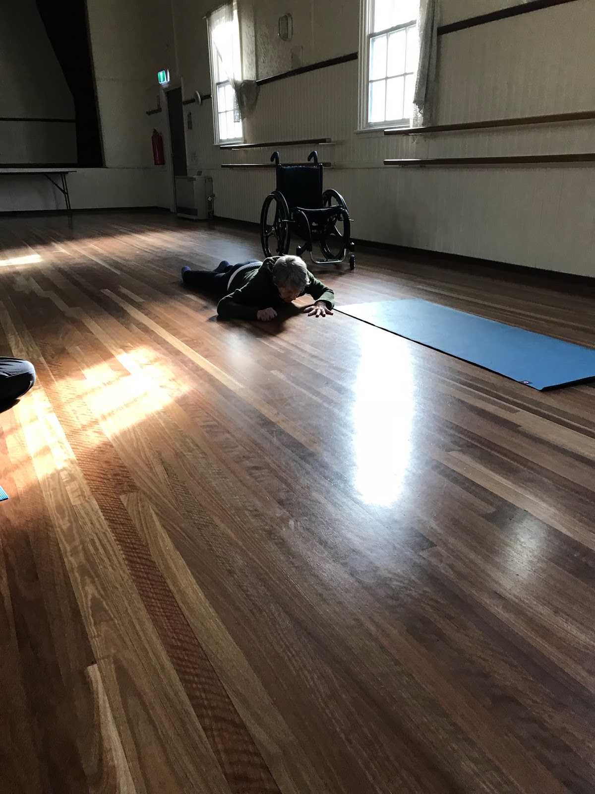 Despite the cold Winter morning in the Yarra Ranges – it was good to re-unite with the space of spaces – at Montrose Public Hall. I could have been an intruder, letting myself into Gretel Tayor’s shared practice space – only the warmth was incredibly welcoming and inspiring. It has been awhile since I have connected with the public hall space and it felt good to be back. My first breath took me by surprise as my body lowered to the floor – I had been doing much breathing focussing on the Yoga mat back at home, and now it was becoming a more real connection to me, when it is my practice to move to the floor – a public floor, and not just the comfort of my home. It was perfect to move alone, and know that two people could move alone – to warm up, move in and out, and through time, through breaths – Movement inspires me to move, no matter what happens next. The coldness fades beneath me, and effort becomes effortless – I see myself in a different light. I don’t close my eyes this time – my mind wanders with my fingers across the floors, shaping bold figures into abstract words, perhaps poetry – then it’s gone, my thoughts have left the space in my mind. I realise just how powerful and extraordinary movement is, even the tiniest shift to a massive leap or jump – it is an effortless joy to find, define and re-fine…
